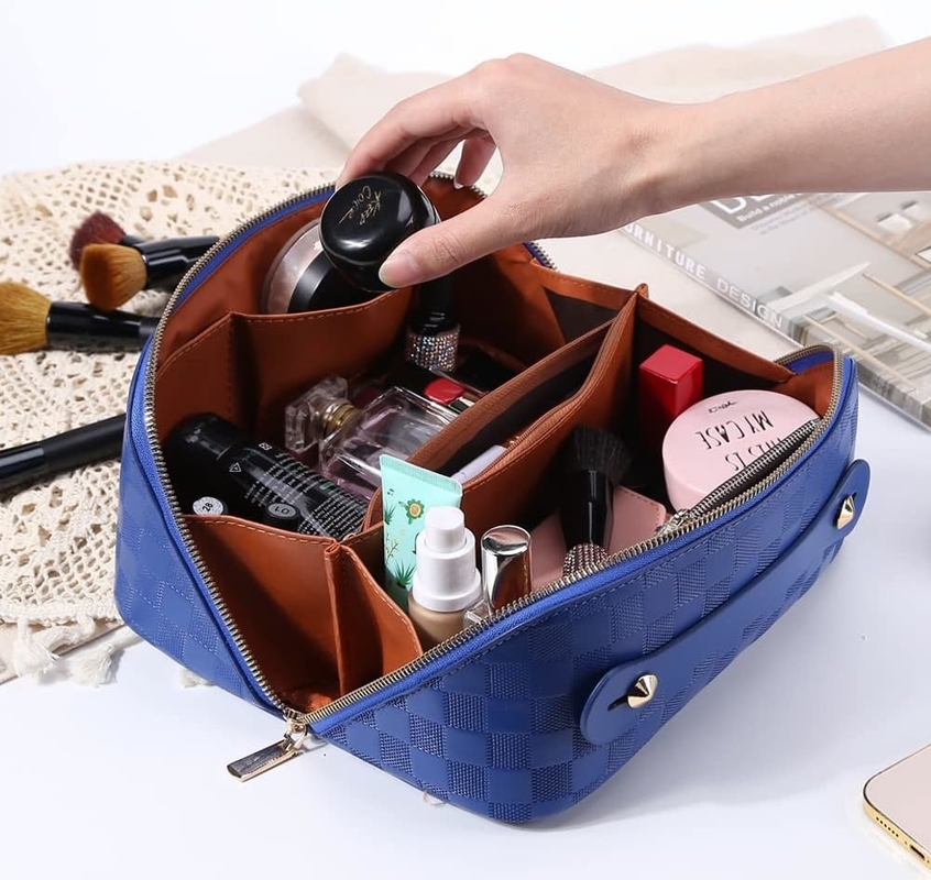 De grote reis make-up tas is een gelaagd ontwerp met 2 hoofdvakken met 4 kleine zakken.De zijkantzakken houden je corrector.En de middelste zak voor make-up borstels en juwelen.