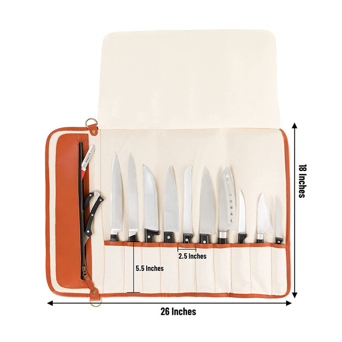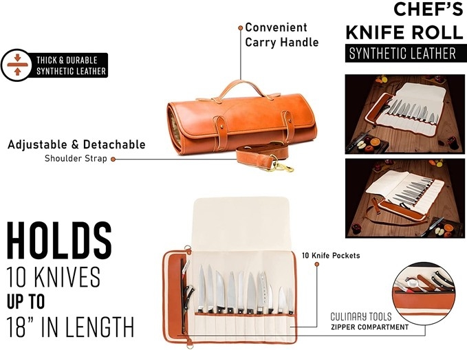 - GEMakkelijke toegankelijkheid Elke professionele mes kit zak bevat 10 keukenmessen en bevat een rits zak voor accessoires zoals lepels, peelers, mes slijpers,keuken schaarOnze 10-slot mes draagtas kan kokenmessen van maximaal 18 centimeter inpakken.