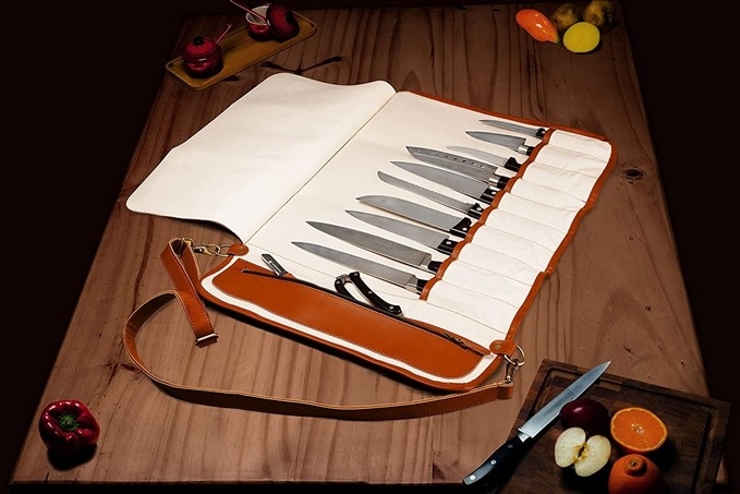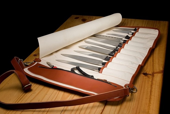 - Onze meszak voor chef-koks weegt 2 pond, maar kan comfortabel meer dan 25 pond aan kookapparatuur bevatten.Elke mesrol heeft een verstelbare schouderband en een draaghandgreep die het gemak en de draagbaarheid mogelijk maakt om uw messen gemakkelijk en veilig te dragen wanneer u naar het werk gaat, culinaire school, kamperen of kookdemonstraties.